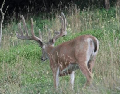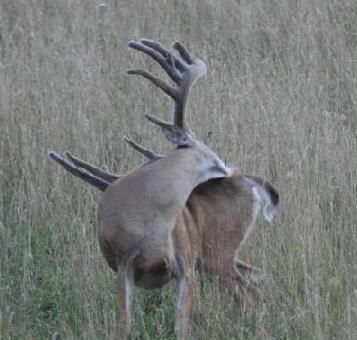 He is unbelievably impressive up close and in person. In velvet he had an unheard of 227inch NET TYPICAL SCI and a 213inch NET TYPICAL B.C. Shock N Awe had a 31 1/2inch beam and 24 1/2inch inside spread. His main frame score was 134 1/8inch and 101inch of Tines. This deer has it on his head and in his background.